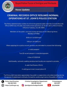 The Antigua and Barbuda Police Administration wishes to inform the general public that the Criminal Records Office (CRO) has officially resumed normal operations at the St. John’s Police Station, effective Tuesday, July 29, 2025.